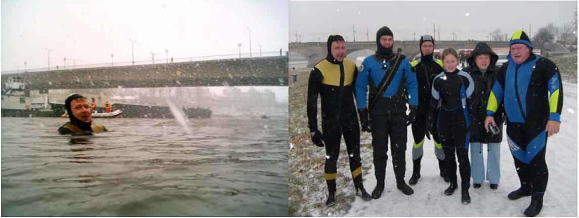 Am 06.01.08 war es wieder soweit! Das Neujahresschwimmen stand wieder an. Das Wetter war nicht das Beste und die Temperaturen waren ebenfalls „saumäßig“ Die Elbe hatte eine großzügige Temperatur von 0,5°C. Als erstes wurde die kurze Strecke 10.45Uhr eingeläutet. Danach ging es weiter mit der lange Strecke. Und da waren wir nun an der Reihe! Mit unseren Anzügen war das ganze halbwegs verträglich. Als wir dann kurz vor der Brücke waren, überholte uns noch ein Frachtschiff. Das hatte auch noch niemand erlebt. An den Händen und Füssen war es ein wenig kalt aber sonst haben wir das wieder gut überstanden!!! ;o)